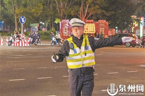 泉州网2月17日讯 (记者黄枫 通讯员庄小强 文/图)指挥交通、疏导车辆、处置事故……元宵节当晚,丰泽交警大队一中队民警邱少栩早早到岗开始执勤。尽管还有几个月就要退休了,但邱少栩像往年一样,没有缺席元宵节的执勤安保。正如他所说的:“正因为我马上要退休了,所以更要站好最后一班岗。”