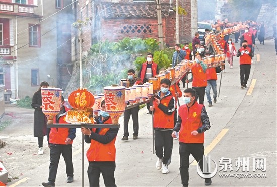 泉州网2月17日 (通讯员林弘梫 记者陈小芬 文/图)一条火龙乡间绕,声声爆竹闹元宵。2月15日,泉港涂岭镇樟脚村一年一度的板凳游龙灯闹元宵民俗活动如期而至。一条条由该村不同姓氏男丁扛着的“板凳龙”,穿梭于村庄古老石巷与乡村田野之中,一路迤逦行进,所到之处,鞭炮连天,锣鼓齐鸣,场面蔚为壮观。