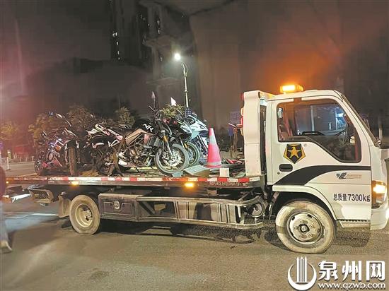 泉州网3月8日讯 (记者黄枫 通讯员庄小强 文/图)个别摩托车驾驶人喜欢驾驶经过改装的机车,“轰轰”的声浪扰民,车辆存在的违法行为也带来不小的安全隐患。近日,丰泽交警连续两晚突击开展整治行动,在中心市区丰海路查扣了7部大功率摩托车,并对5部非法改装的“咖啡车”作出处罚。