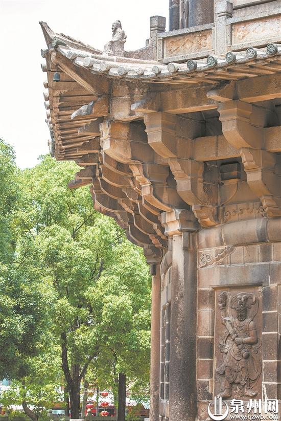 开元寺里更重量级的,还是东西塔。由老桑树向西便是西塔仁寿塔,建造过程中先木构、后砖构,经过数次灾后重建,绍定元年(1228年)改建为石塔,历时10年建成。塔身上的浮雕各不相同,刻有手握戒刀的孙悟空像。东塔镇国塔,始建于唐咸通六年(865年),与仁寿塔形制相仿,但更高大,雕凿也更精致。这两座塔曾在1604年的8级地震中屹立不倒,它们因此成为泉州的精神象征。