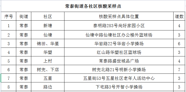 常泰街道各社区核酸采样点(14日)