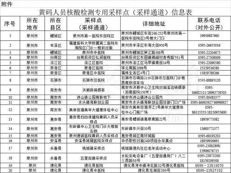黄码人员核酸检测专用采样点信息表