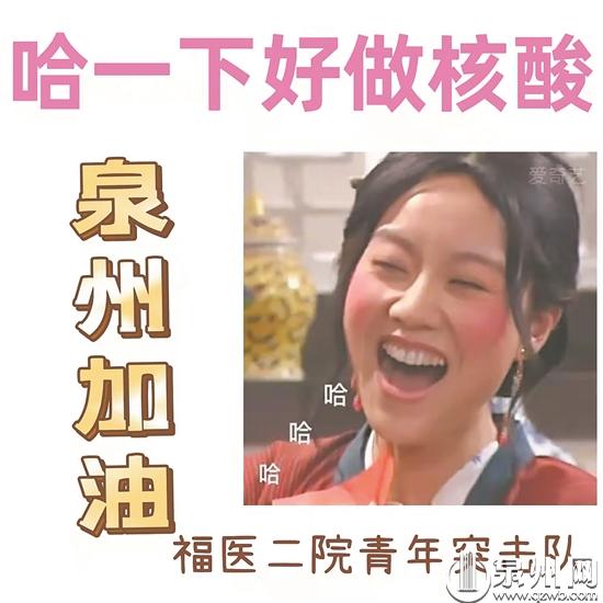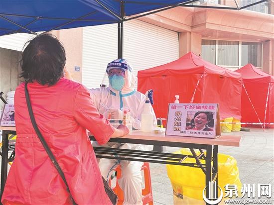 “哈一下好做核酸。泉州加油!”“哈哈大笑吧,这样做核酸不会难受。没有一场疫情不会结束,加油!”在位于丰泽区田安南路福新商厦的核酸采集点,程思贤医生正认真地为群众采集核酸,桌上摆放的两张表情包图片很是显眼。