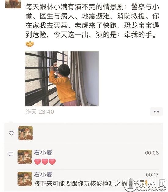 “16日凌晨,小区开始封闭管理。”林先生这几天在家里陪孩子,有演不完的情景剧:警察与小偷、医生与病人、地震避难、消防救援……“孩子把动画片里看到的场景,全部套出来一遍一遍地演。”虽然孩子还小,但他们夫妻每天都很认真地对她讲防疫的事,跟她说外面的医护人员很辛苦,让她好好配合做核酸检测,孩子在核酸采样时都非常自觉地张大嘴巴。