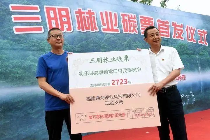 去年5月18日,三明市将乐县高唐镇常口联村党委书记张林顺领到了中国编号为“0000001”的碳票,涉及常口村的3197亩生态公益林。经第三方评估测算,监测期碳减排量12723吨。其中,2723吨碳减排量,当天就被福建通海镍业科技有限公司以4.0845万元人民币的价格买走。