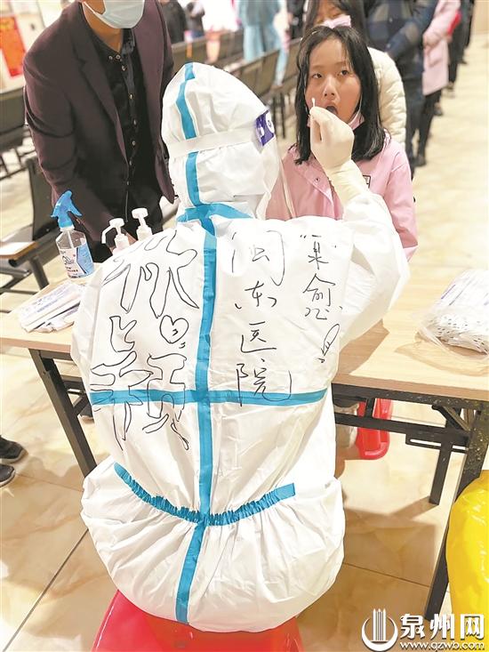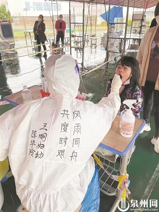 “福鼎肉片支援安海土笋冻必胜”“漳州四果汤支援东石海蛎煎”“共度时艰,风雨同舟”,连日来,在各个核酸采样现场,一句句写在防护服上的暖心话语,传递着省内各地医护人员在关键时刻,与泉州人民守望相助的决心与信心。
