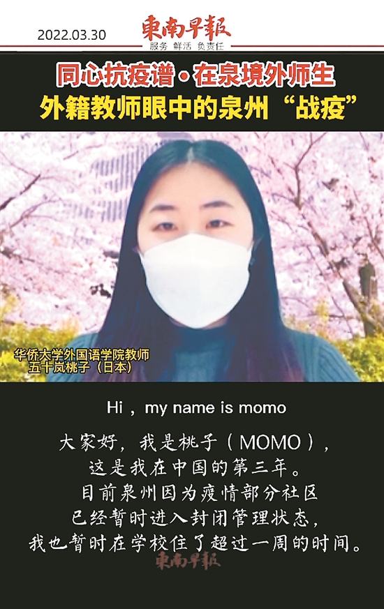“政府和学校在应对疫情方面十分迅速,且准备充分,我觉得没什么不方便的。”五十岚桃子三年前从日本来到华侨大学外国语学院任教,现已在泉州成家,这里也是她的“第二故乡”。