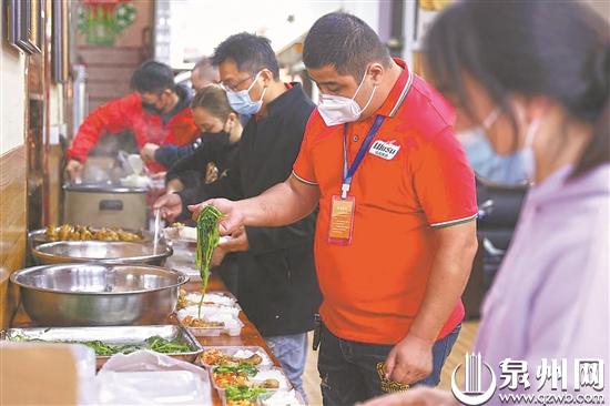 新疆维吾尔族小伙子阿力(身穿红衣)正在为泉州一线抗疫人员准备爱心餐 (吴嘉晓 摄)