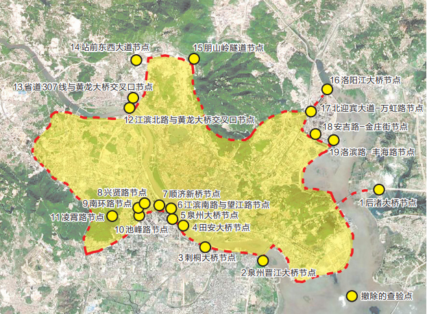 这19个交通查验点分别是:洛阳江大桥节点、后渚大桥节点、泉州晋江大桥节点、刺桐大桥节点、田安大桥节点、泉州大桥节点、江滨南路与望江路节点、顺济新桥节点、兴贤路节点、南环路节点、池峰路节点、凌霄路节点、江滨北路与黄龙大桥交叉口节点、省道307线与黄龙大桥交叉口节点、站前东西大道节点、朋山岭隧道节点、北迎宾大道-万虹路节点、安吉路-金庄街节点、洛滨路-丰海路节点。