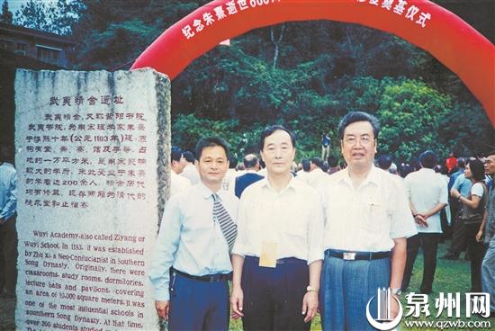 2000年10月,蒙培元(中)、何乃川(右)教授与林振礼在武夷书院奠基仪式上合影。 (图片由受访者提供)