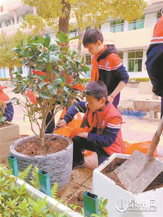 今年2月,丰泽区第五中心小学募集了108个花盆,一至五年级每班各分配4个,各班组织学生从各种渠道收集花草、蔬菜或农作物,再由师生、家长配合种植到花盆里。种植完成后,每个盆栽配上卡片,写上植物的名称、习性及功效等,学生在种植的过程中可以了解到植物生长、种植的相关知识。