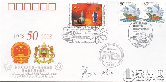 2008年11月1日中国摩洛哥建交50周年外交封上有德化窑军持邮戳
