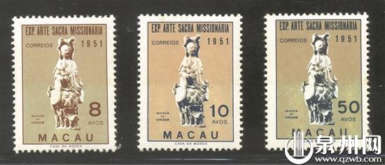 达摩、观音、动物、瓶、壶、炉、杯……经过近40年的收集,王金镭收藏的德化窑邮票题材广泛,涉及古今中外。其藏品中,一套1953年发行的德化窑邮票特别醒目。这套邮票是1997年首次在澳门出版的邮票目录上看到,当时他感觉这很像德化窑,但因为邮票上的文字均为外文,图片也不够清晰,难以辨认。经过十年以上对发行背景资料的多方查找,直到2008年才确认是清代德化窑送子观音邮票。据悉,这是1953年4月28日葡萄牙在澳门发行的一套以清代德化窑瓷塑送子观音为题材的纪念邮票,名称为《圣像展览会纪念》,印制机构为葡萄牙造币厂。