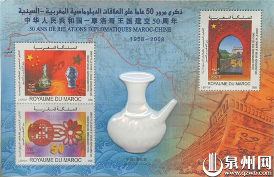王金镭收藏的世界首枚“丝绸镶嵌陶瓷邮票”小全张同样引人注目。2008年,为纪念摩洛哥与中国建立外交关系50周年,摩洛哥邮政部门特发行《中华人民共和国——摩洛哥王国建交50周年》丝绸镶嵌陶瓷邮票小全张。据悉,这是世界上首枚陶瓷邮票小全张,3枚邮票图案分别为摩洛哥古城门和中国长城、两国典型瓷器、两国传统窗棂,并均印有中摩两国国旗图案以及“50”字样。小全张特别选取中国瓷都德化白瓷军持镶嵌在丝绸上,勾画出当年由摩洛哥到中国福建泉州“海上丝绸之路”的路线,600年前,摩洛哥大旅行家伊本·白图泰曾到过泉州。如今,德化瓷再次以“国家名片”的角色,演绎两国源远流长的深厚友谊。为纪念中摩建交50周年,中国集邮总公司同时发行该题材外交特种纪念封。