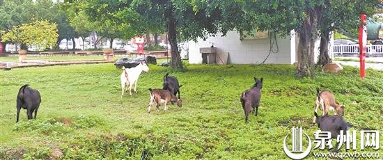 昨天上午,按照周先生提供的方位,记者来到笋江路和池峰路交界处的草地上,看到草地上有七八只黑、白、褐色的山羊,有的正“咩咩”地叫着吃草。草地旁有一块牌子写着街心公园,正对着海西汽配城。现场空气中弥漫着一股山羊特有的味道,草坪也被啃食得一片狼藉,有的地方甚至露出泥土。