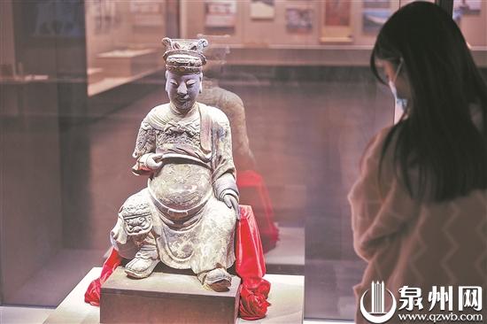 此外,首次在中国闽台缘博物馆展览的“清泥塑彩绘郑成功坐像”,通高0.88米,这是迄今发现的年代最久、体量最大的清代郑成功坐像。坐像头戴金漆冠冕,左右身衣饰相异,左侧身披长袍,左足踏翘尖薄底靴,右侧身披铠甲,右膝穿虎头锁子甲,右足着虎头战靴,冠冕、铠甲及身上纹饰等均髹金漆。文物系中国闽台缘博物馆2015年赴台征集所得。为让文物安全抵泉,海峡两岸有识之士通力合作,用独立货柜护送坐像渡海而来。