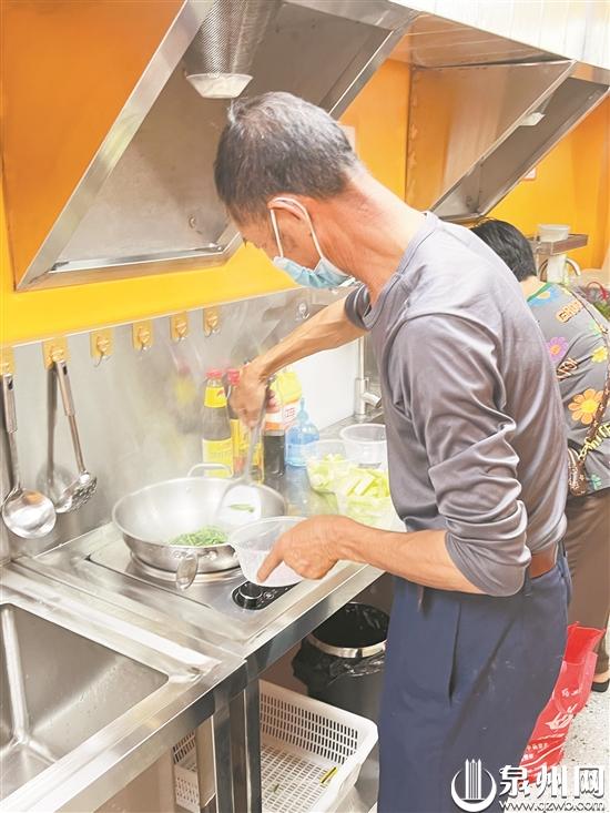 同样来自南安的陈阿伯也是爱心共享厨房的“熟客”,他今年70岁了。老伴摔倒后,被送到附近的福建医科大学附属第二医院住院治疗,他负责陪护照顾。由于不懂得用手机扫码,小叶先替陈阿伯扫码,待煮饭结束后,陈阿伯再用现金结算。“这里各方面都非常好,特别对于病患家属来说,距离比较近,且干净卫生,工作人员的服务态度也非常好。”陈阿伯说,像他们这样的病患家属,需要这样的场所,能够煮点饭菜给病人吃。