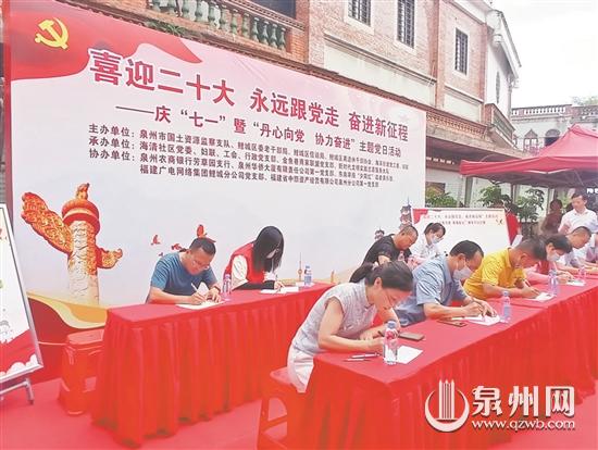 泉州网6月30日讯 (记者苏玮杰 通讯员吴雅颖 文/图)6月29日,鲤城区海滨街道海清社区党委、妇联、行政党支部、新时代文明实践志愿服务大队同共建单位泉州市国土资源监察支队、东南早报“夕阳红”读者俱乐部等在金鱼巷一起开展庆“七一”暨“丹心向党·协力奋进”主题党日活动。