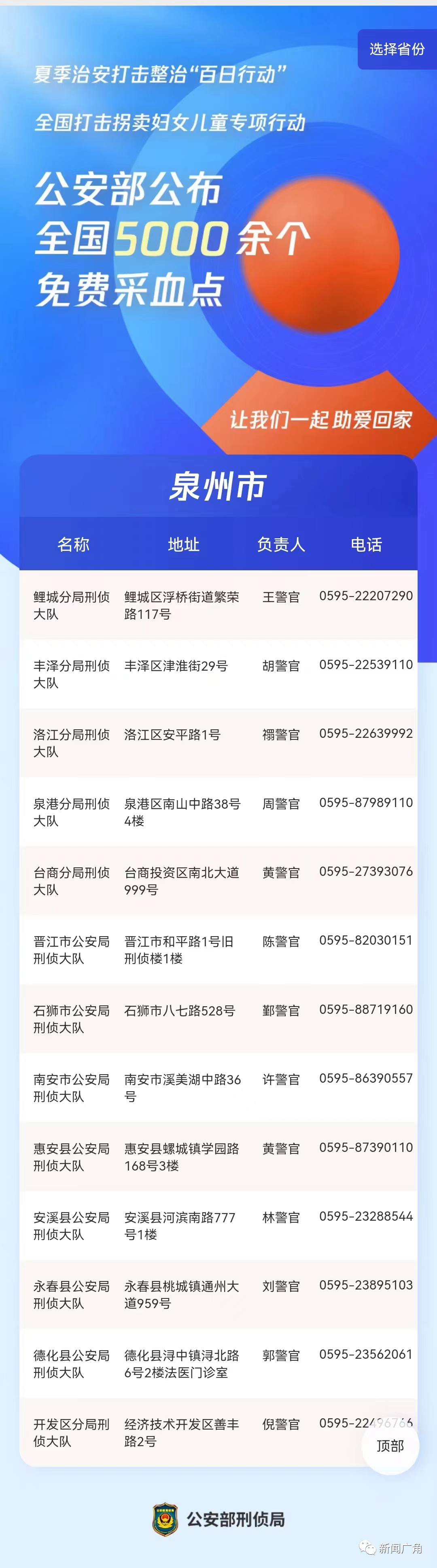 近年来,公安部会同有关部门依法严厉打击拐卖犯罪,累计设置3000余个免费采血点,并向社会公布地址、联系电话,为协助案件侦办、帮助群众寻亲发挥了积极作用,帮助一大批离散家庭实现了团圆。今年3月,公安部会同民政部、国家卫健委、全国妇联部署在全国组织开展新一轮打击拐卖妇女儿童犯罪专项行动。公安部在此前公布免费采血点基础上,通过梳理汇总、集中资源,将免费采血点数量增至5000余个,并通过多种平台集中发布相关信息,进一步扩大免费采血点覆盖面。