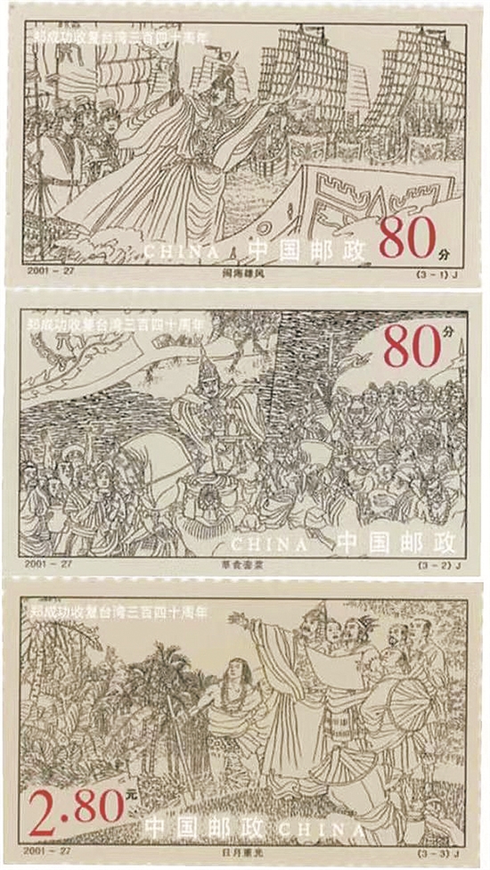 《郑成功收复台湾340年》:三枚邮票均以不同主题表现郑成功的历史功绩,足见郑成功在台湾历史发展进程中扮演的重要角色。