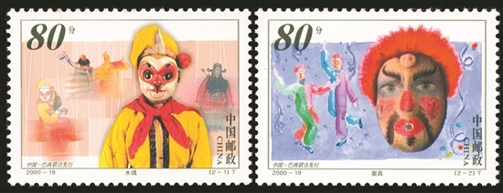 1974年8月15日,巴西与我国正式建立了外交关系。多年来,两国政府和人民的友谊不断得到巩固和发展。2000年,根据中巴两国邮政主管部门签署的协议,决定联合发行以展现传统戏剧文化为内容的邮票,使两国邮政加深了了解,增进友谊,为双方进一步合作打下基础。在选题上,选择了中国泉州历史悠久的木偶戏和巴西人民欢庆节日时佩戴的面具,两者都是两国人民悠久文明和灿烂文化的艺术表现形式。