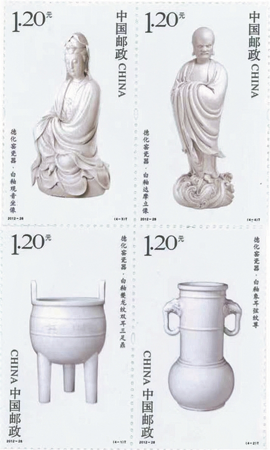 “中国陶瓷——德化窑瓷器”特种邮票发行于2012年10月20日,是泉州首次以地方题材独立发行邮票。该邮票一套4枚,内容选自故宫博物院的藏品,图案分别为:白釉夔龙纹双耳三足鼎、白釉象耳弦纹尊、白釉观音坐像、白釉达摩立像,面值均为1.20元,设计者为著名邮票设计家谷玉宝。