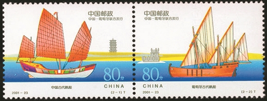 《古代帆船》是中国国家邮政局和葡萄牙邮政部门为了增进两国之间的友谊,于2001年11月8日联合发行的特种邮票。邮票全套2枚,分别描绘了中国的宋代帆船、葡萄牙的三桅三角帆帆船。