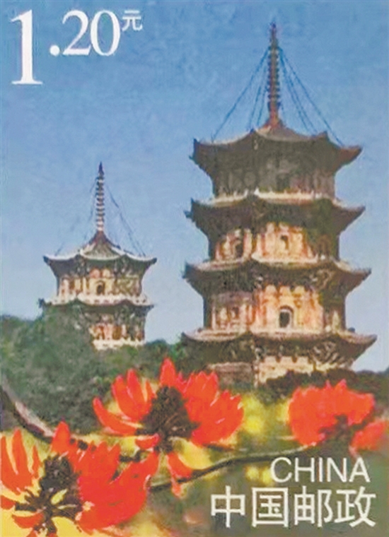 邮票上的东西塔与火红的刺桐花
