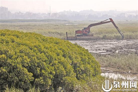 在泉州湾洛江段,挖掘机在滩涂上作业,将成片生长的互花米草铲除深埋。