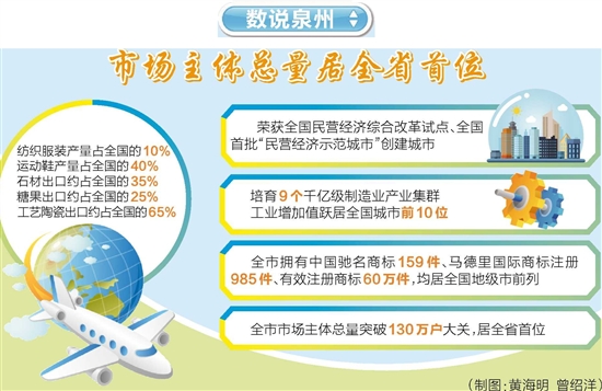 形成泉商网络。泉州在世界170个国家和地区遍布950万泉籍华侨华人,成立上千个侨团组织和250多家异地泉籍商会,200多万人在外经商。同时,泉州本地涌现出一大批爱拼敢赢、根植性强的民营企业家,全市市场主体总量突破130万户大关,居全省首位。