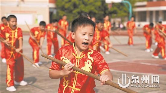 看,小学生们虎虎生风,随着音乐的节拍,喊着响亮的口号,一招一式彰显武术的神韵气度,个个像武术行家。看,他们时而屏气凝神、运足内气、单棍出击、铿锵有力;时而武姿优雅、刚柔并济,一招一式无不体现了中国武术的博大精深。