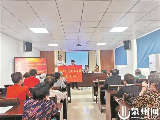 2022年10月20日,鲤城区海滨街道老年学校党支部成立仪式在海滨街道金山社区“党建+”邻里中心举行,这是鲤城区街道老年学校成立的第一个党支部,加强了老年学校的党建引领和学员的思想政治建设,提高学员参与党组织生活的便捷度,并将带领老校党员学员积极参与有益的社会文化活动和志愿服务,为老党员发挥正能量搭建更多的参与平台。