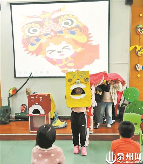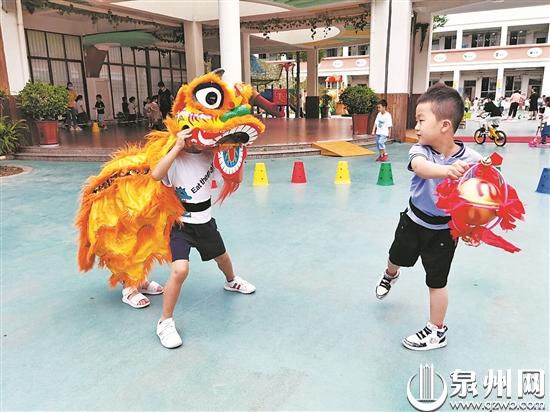 用醒狮装点墙面,以萌狮作为吉祥物,把狮阵文化、舞狮文化等融入课程……为了让小朋友们能够在愉快的氛围中学习狮文化知识,引导他们感受积极向上的“狮子精神”,泉州市一些幼儿园将“狮元素”带入学园中,用来装饰校园环境,提升校园文化内涵。同时,利用狮文化打造富有特色的幼儿主题课程,通过寓教于乐的方式,使小朋友们既锻炼动手能力、强健体魄,也拓宽视野,增长知识。