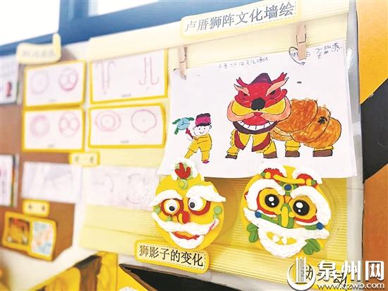 同样把狮文化引入校园环境中的还有石狮市锦尚镇第二中心幼儿园。如今走进该幼儿园,能在走道长廊中看到不少与狮有关的主题墙绘,以及小朋友们以黏土、剪纸、绘画等方式创作的舞狮、醒狮头、狮阵等手工作品,在楼道的墙面上也有一些“狮”展板,当中既有当地卢厝狮阵文化的历史起源、表演方式的介绍,也有与狮文化有关的俗语童谣,让小朋友们随时都能学习到与狮文化有关的小知识。
