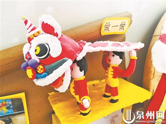 小朋友用黏土制作的舞狮场景(石狮市锦尚镇第二中心幼儿园 供图)