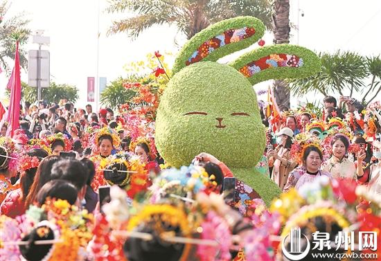 蟳埔社区的人们簇拥着“蟳埔簪花兔”踩街祈福(泉州晚报社资料图片)