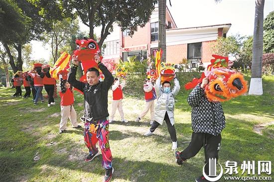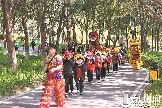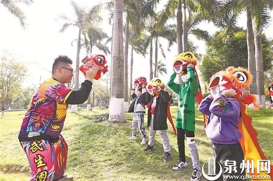 近日,30多名晋江小学生走进晋江八仙山公园,在专业教练的指导下学习舞狮、舞龙基本功,并分组进行现场表演,吸引了不少游客围观。
