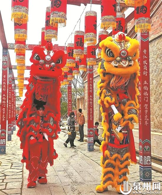 陈教练带领舞狮队伍在晋江梧林传统村落表演