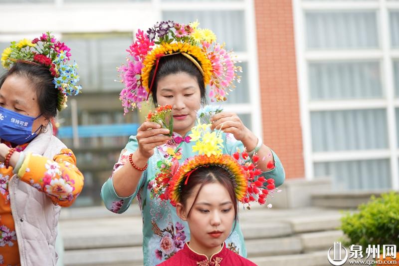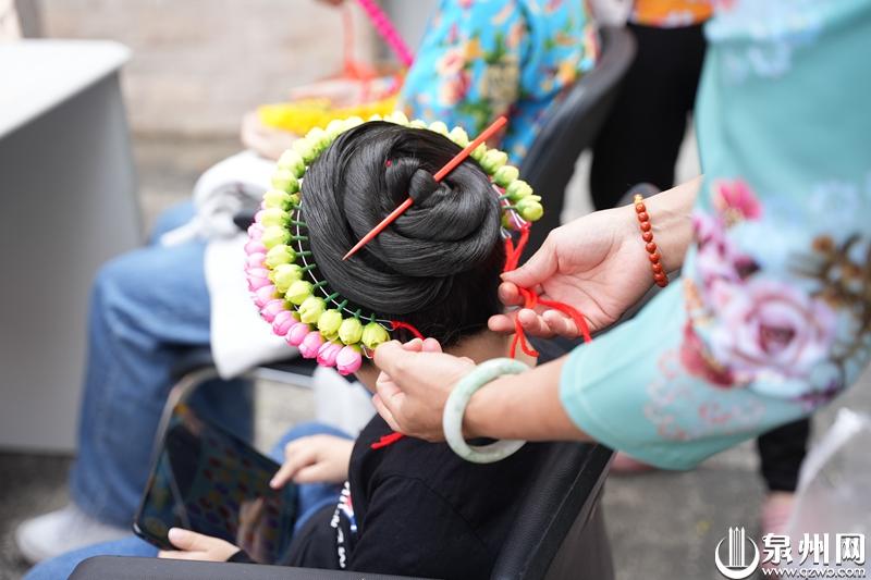 黄瞻女士简要介绍了簪花围的历史脉络,簪花围始于宋代,有位生活在泉州的阿拉伯人,建了一个花园,园里有许多从西域引进的奇花异木。他经常将鲜花赠送给相邻的蟳埔女簪戴,于是渐成蟳埔女发髻簪花习俗。早期的蟳埔女从孩提起,就把头发留长,到十一二岁将秀发盘于脑后,系上红头绳,梳成圆髻,然后再穿上一支“骨髻”,另用鲜花的花苞或花蕾串成花环,少则一、二环,多则四、五环,再以发髻为圆心,圈戴在脑后。黄瞻说到保留这样的蟳埔文化,体现了泉州蟳埔女对美好生活的向往和共同的文化传承记忆。