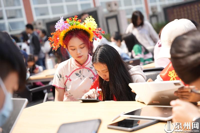 黄瞻女士还为在场的师生进行体验式簪花,现场进行要点教学,动作要领指导,分解每一个步骤,寓教于乐,为师生上了一堂生动的非遗技艺课。在活动现场,泉州师范学院图书馆还联合华为天生会画举办了一场“簪花绘画秀”。华为天生会画将科技带入非遗,让学校师生在体验簪花的同时,通过平板绘画将这一非遗传承技艺记录下来,以创新、有趣的方式为广大师生带来非遗之美。