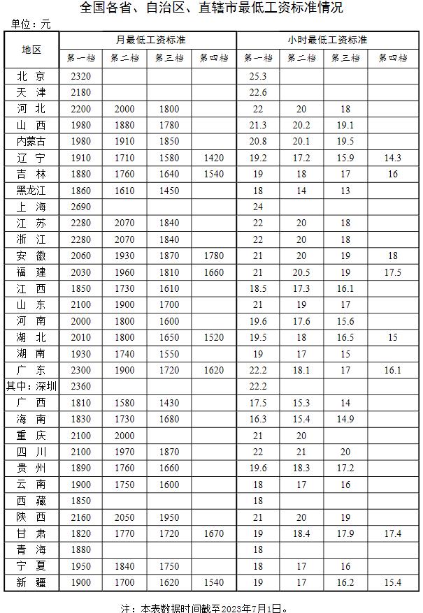 人社部官网近日公布了全国各省、自治区、直辖市最低工资标准情况(截至2023年7月1日),其中,刚刚上调最低工资标准的上海,月最低工资标准继续稳居全国首位。