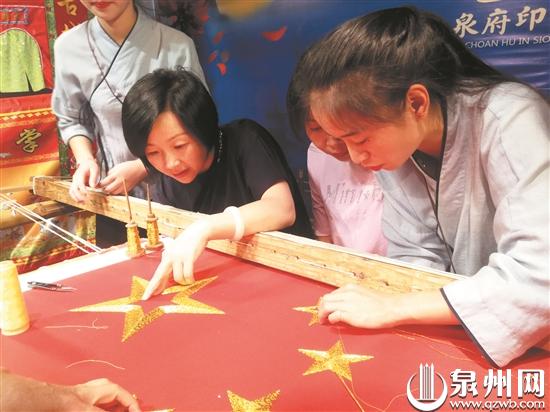 事实上,这是林秀清领衔绣制的第二面五星红旗,前不久,一场名为“泉州非遗金苍绣 千人万线绣红旗”的活动,在泉府印象艺术馆举行起针仪式。当天,在她的示范指导下,逾百人同绣红旗。厦门游客王晓思说:“亲手绣国旗,更能感受到国旗对我们的意义。”