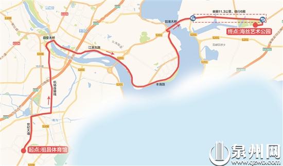 ★路线详情:晋江祖昌体育馆—世纪大道—双龙路—机场连接线—田安大桥—江滨北路—丰海路—后渚大桥—东西大道(东西大道与后渚大桥交接处至东西大道与杏秀街交接处,单圈11.3公里,绕行6圈)—杏秀路—亚艺街—海丝艺术公园,全程约102公里。