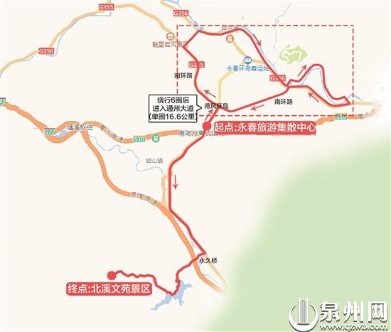 ★路线详情:永春旅游集散中心出发—S206(1.8公里)—德风环岛左转南环路(开始绕圈)—直行南塔岭隧道—右转县医院(S206)—右转桃源南路—三岔路靠左湖滨路—桃源南路—左转留安大桥—右转轻纺路—右转轻工南路—右转新鸿安大桥—右转S306(桃源南路)—左转南环路—(单圈16.6公里,绕行6圈)—德风环岛左转S206—右转永久桥—北溪文苑景区门口。全程约112公里。