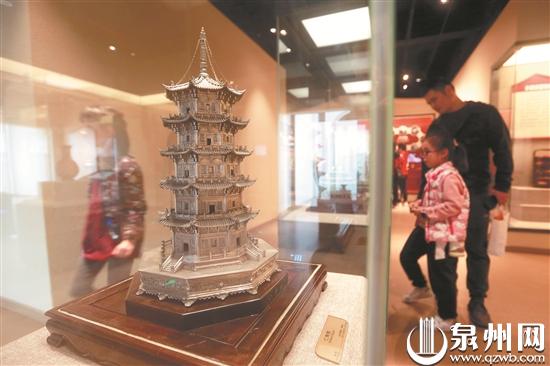 泉州锡雕工艺历史悠久,对于杨氏锡雕而言,创新和传承同样重要。非遗馆里陈列着杨家第五代传承人杨峰岩、杨峰峪创作的镇国塔、紫禁城角楼等锡雕作品,也有第六代杨婉红和杨曙宏的锡盘、锡杯等作品。“锡原料十分软,如果用机器成形,很容易变形。所以几百年来,我们都采用手工制作,柔软的锡通过反复锤炼打磨和精心雕刻,呈现出不同形状,有了美丽的纹路。”