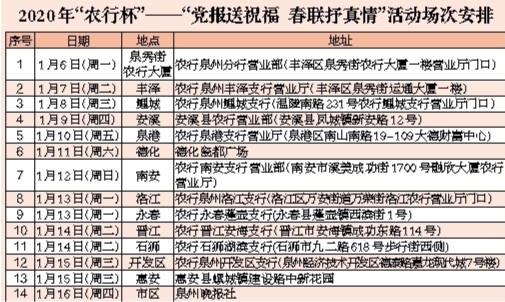 由中国农业银行股份有限公司泉州分行、泉州市文联、泉州晚报社联合主办,泉州市书法家协会、泉州市青年书法家协会、泉州市老年书画研究会、泉州市老年大学、泉州历史文化中心、泉州晚报社书画研究院协办的2020年“农行杯”——“党报送祝福 春联抒真情”活动,将于下周一(1月6日)在中心市区泉秀街农行泉州分行营业部正式启动。今年的活动主办方依旧准备了一万副春联,书法家们将奔赴泉州市大部分县(市、区),现场书写饱含热情与祝福的春联。