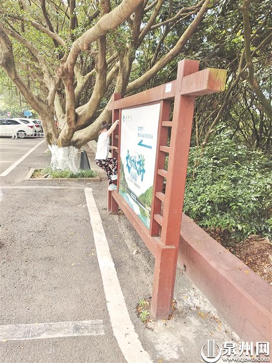 在离山门不远的众妙之门前,立着几块“文明旅游”宣传栏,几名大人带着3个小孩在休息。小孩吃完东西后,手脚并用比赛爬宣传栏,一旁的大人却视而不见。