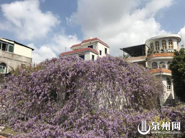 这株紫藤开枝散叶,向左邻右舍蔓延,让几户人家在花枝的覆盖下,好像变成了同一个庭院,远远看去,分不清紫藤到底是谁家的,非常有特色。