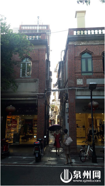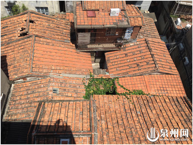 巷内古厝的红屋顶,中间冒出一丛绿色,充满生气。
