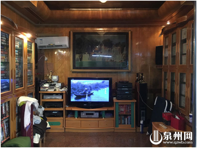 两位老人的精神世界非常丰富,客厅中央是电视机和播放机,旁边还有一个麦克风,左侧书柜内摆满了各种国产电视剧,右侧书柜则是周先生亲自录下来的各类歌曲节目。看着电视剧《铁道游击队》,周太太还可以清楚地记得几十年前老版《铁道游击队》的主演是谁。